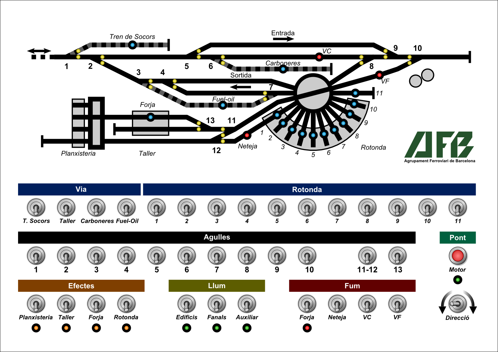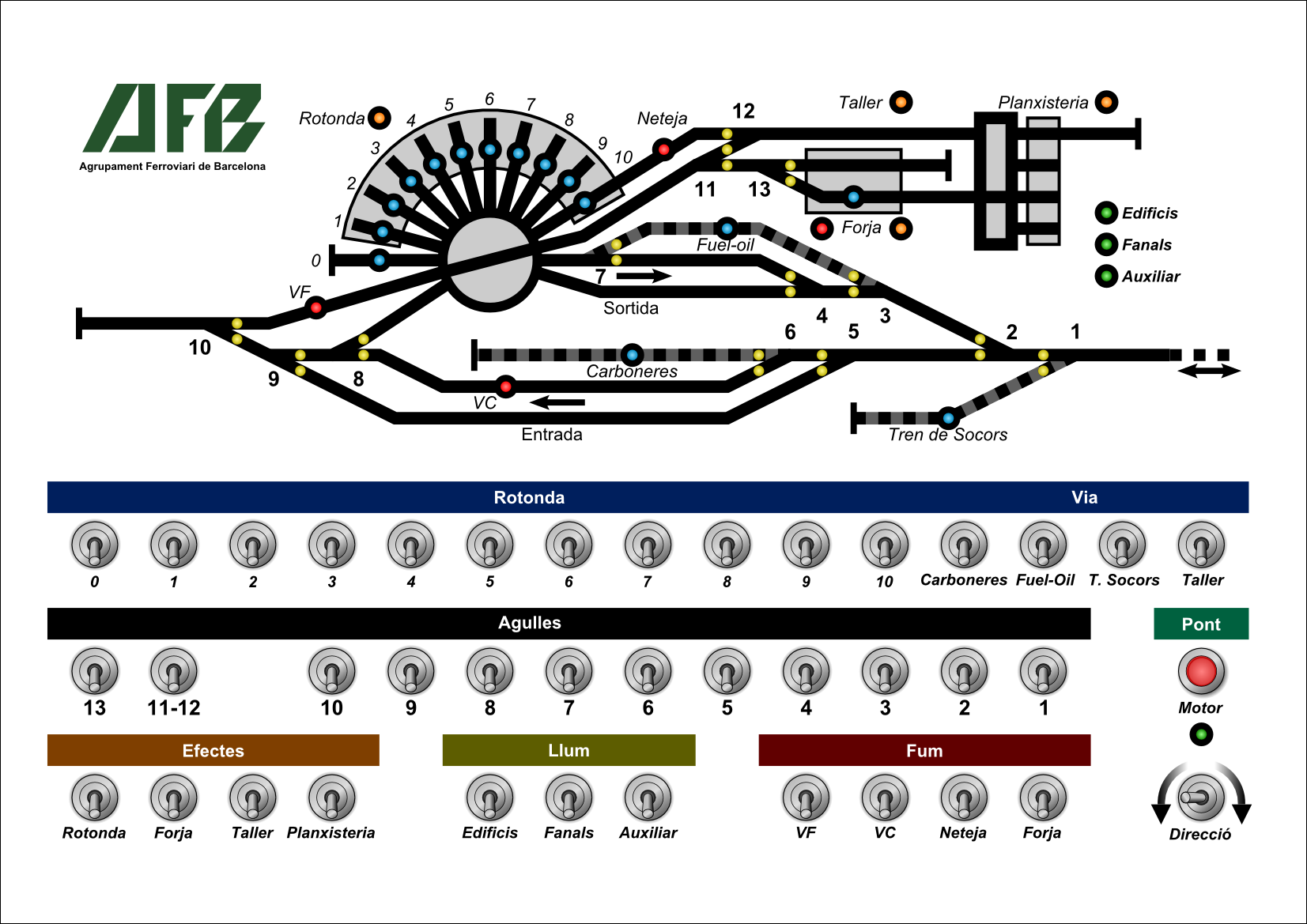 - Fums. Per potenciar aquests elements d'interactivitat he inclòs un quart comandament afegit als anteriors, que he destinat a la via de neteja, a on també es des-vaporitzen locomotores o si més no l'aigua de la neteja de la caldera surt barrejada amb força vapor. Respecte a l'indicador de la xemeneia, l'he retirat de la cantonada del taller (a on es situa de fet la forja) i l'he acostat al nom de la forja (dons la xemeneia pertany a aquest edifici de fet).