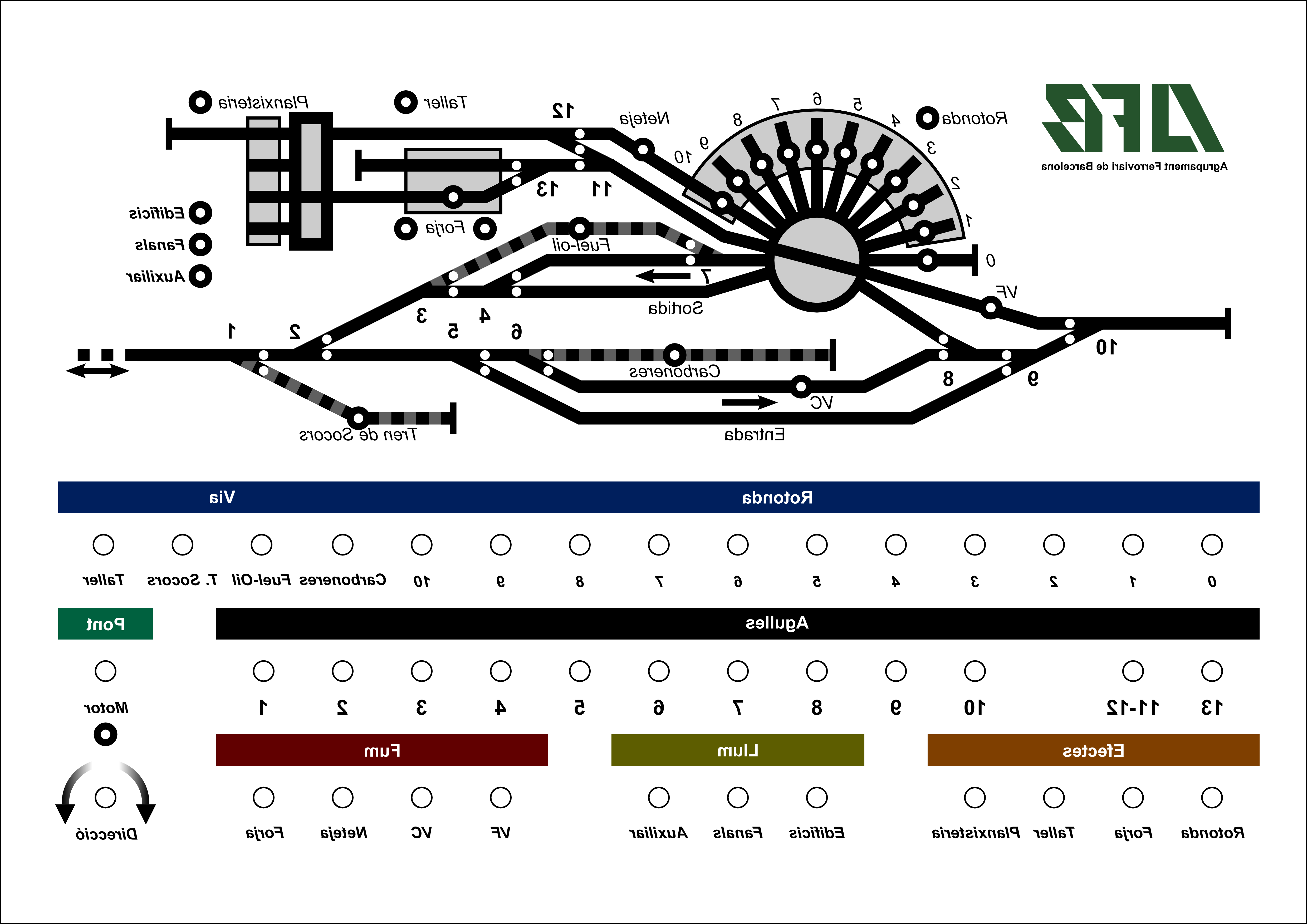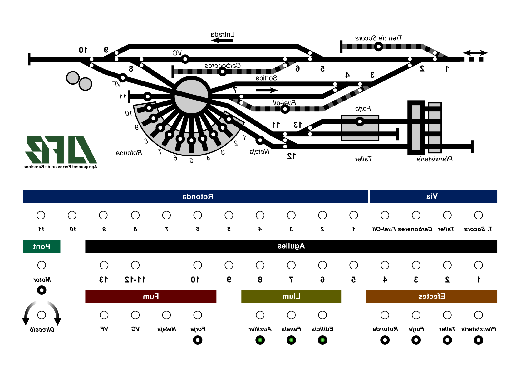 La possible vista seria quelcom així, aprofitant per introduir un canvis al panell en els que ara es visualitzen les agulles en la posició en que realment estan al dipòsit (i per tant amb l'ordre correcte respecte a la numeració). Per tant els comandaments d'agulles els he invertit també amb el mateix sentit. I també per el mateix motiu, he invertit els controls d'alimentació a les vies i he renumerat les vies del dipòsit de esquerra a dreta (en la nova posició de la rotonda) quedant la via exterior com a via 11 (i no com a via 0).