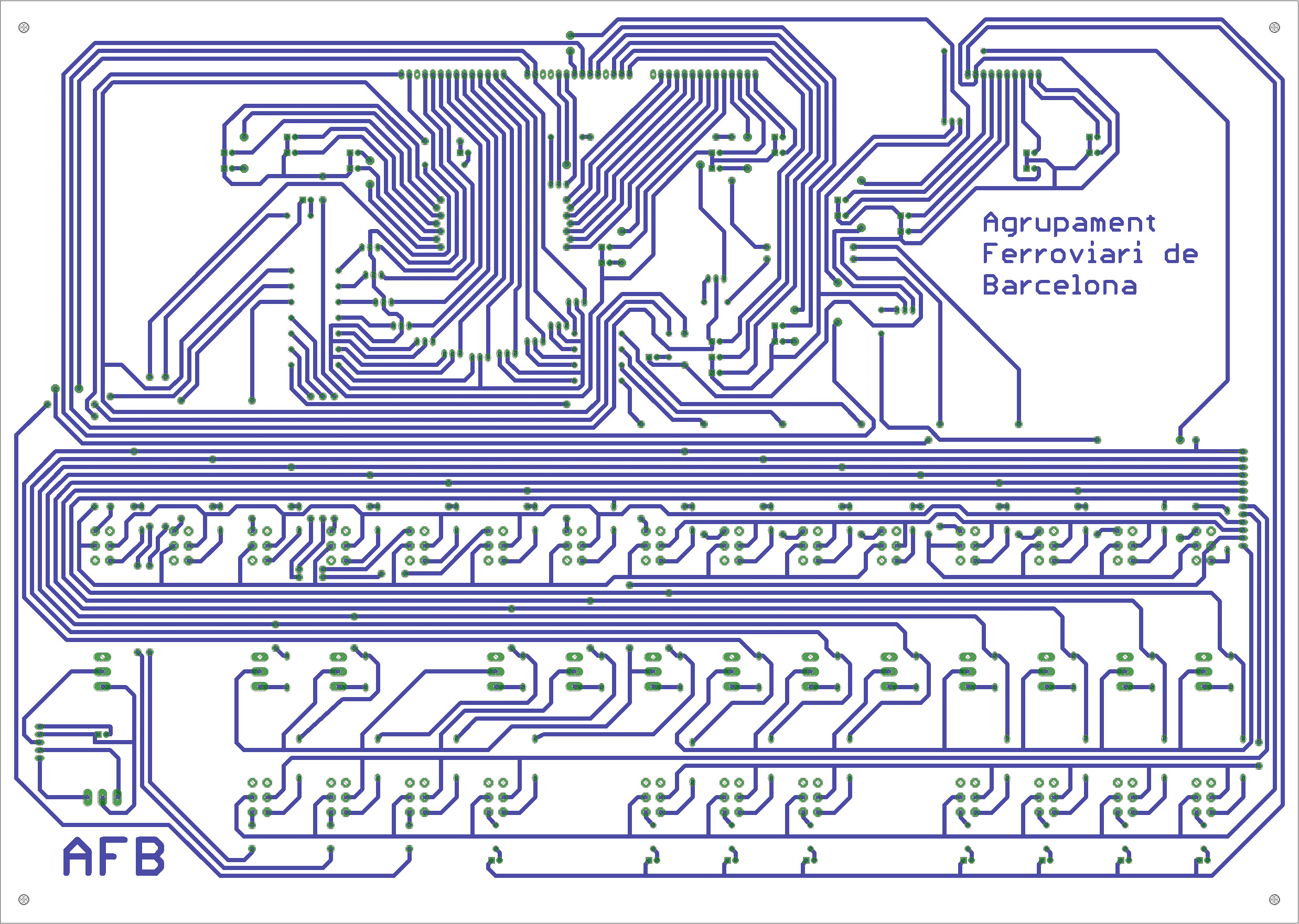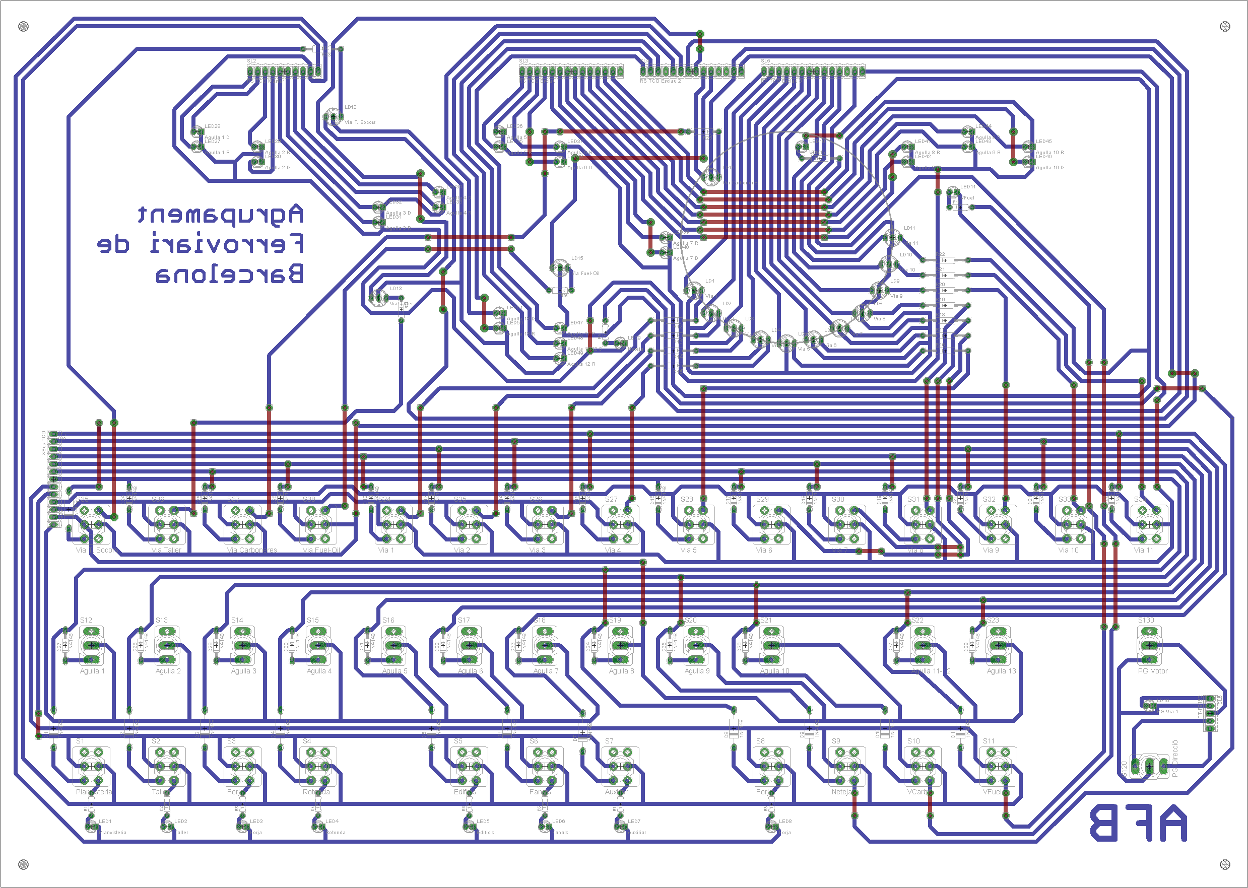 Ara bé, el "pintat" de les pistes ha estat un altre cosa. Finalment he treballat només amb una cara de coure (si podem fer-ho a dues cares serà molt millor i costarà poc refer el disseny). Les pistes estan representades en color blau, mentre que les pistes vermelles que hi apareixen representen ponts per la cara de components.