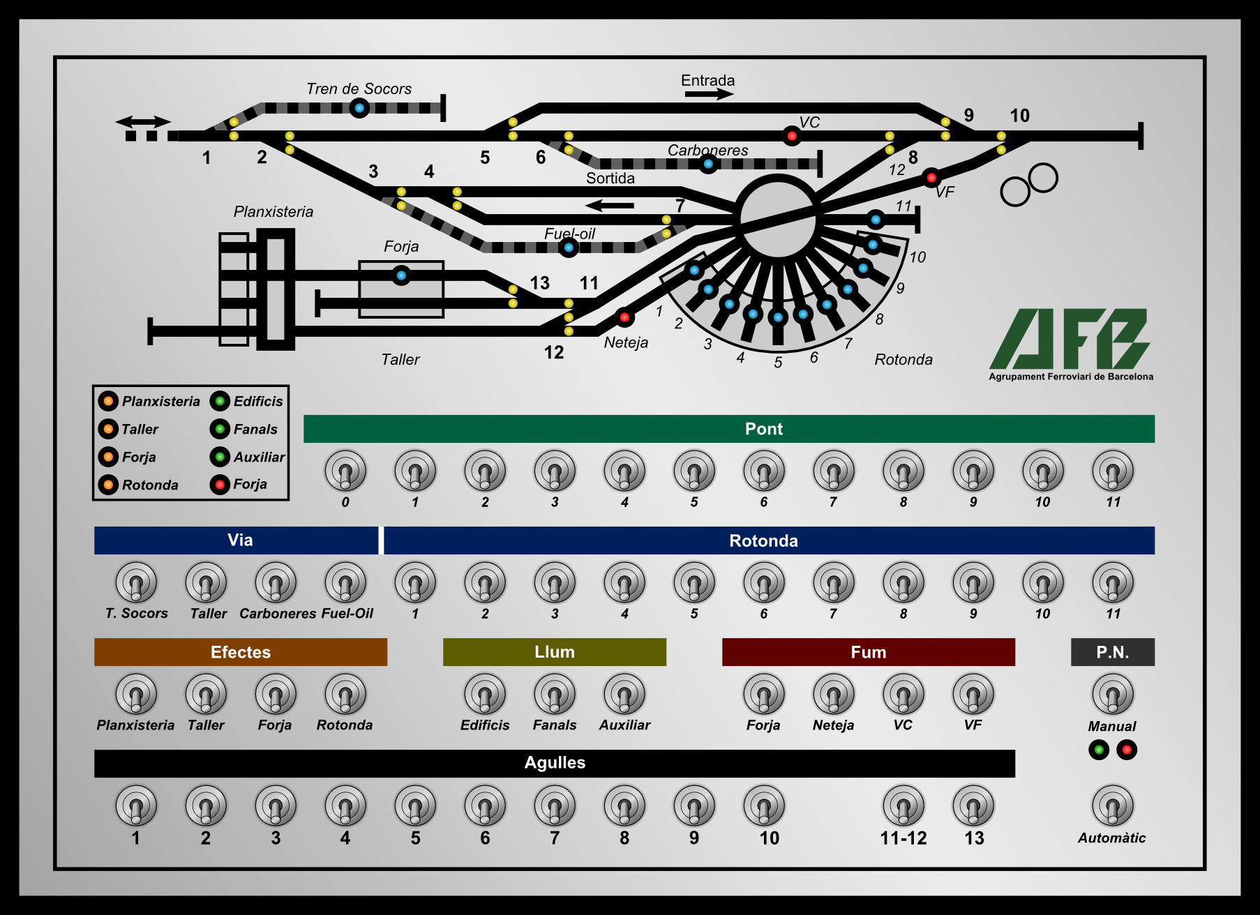 Amb aquesta manera d'actuar mantenim la línia estètica de la resta de comandaments per palanques i no incrementem "massa" el conjunt de comandaments. Aquesta "línia" de palanques la he ubicat a sobre de les palanques de les vies de forma que coincideixin els números de via pel que fa a les 11 vies de rotonda. Per a donar cabuda als nous interruptors, he hagut de desplaçar l'esquema de vies cap a dalt i suprimir la línia d'indicadors visuals sota els comandaments d'efectes, llum i fum; que he ubicat en una "capsa" d'indicacions a banda.