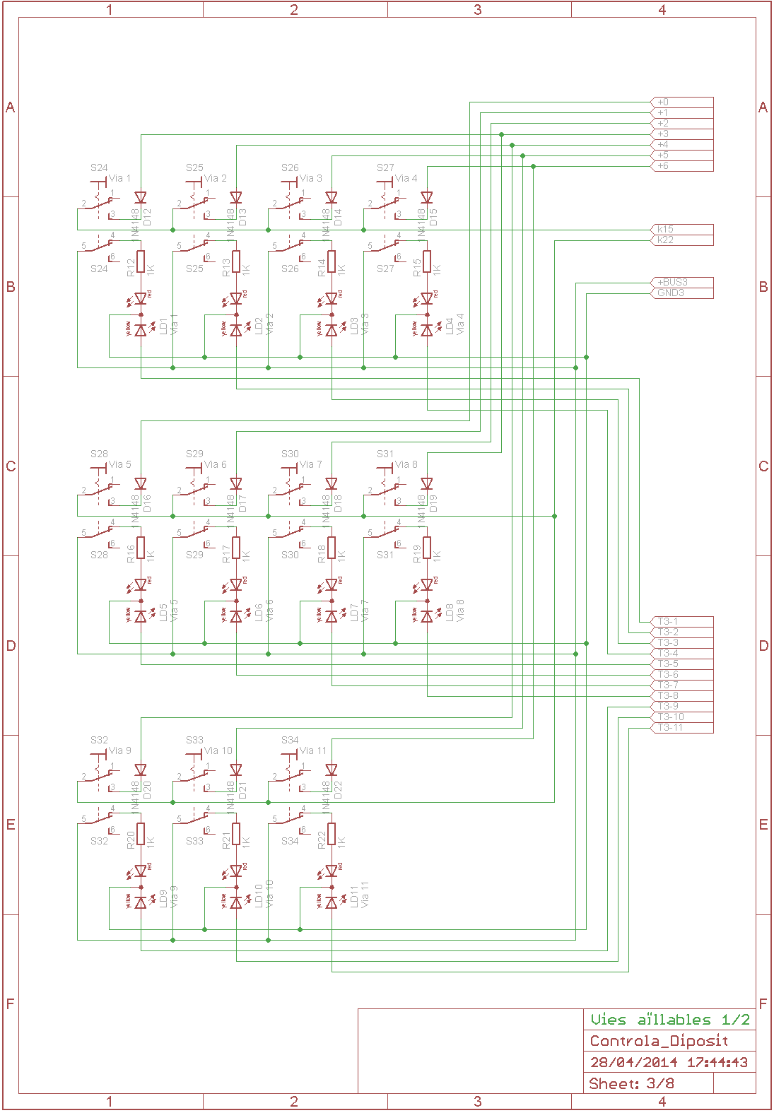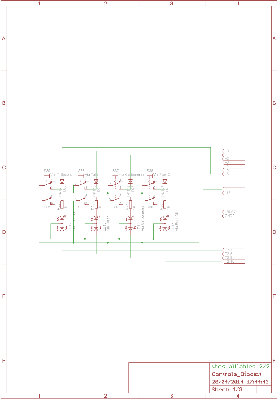 Pel que fa als LEDs indicadors, són els famosos LEDs Duals, el color groc està alimentat per els detectors i es tramet mitjançant onze sortides de la targeta esclava 3 (T3-1 a T3-11). El color blau es comanda directament pels commutadors i per tant s'alimenten pel senyal positiu de la targeta esclava 3, ja que els LEDs comparteixen com a retorn la massa d'aquesta targeta.