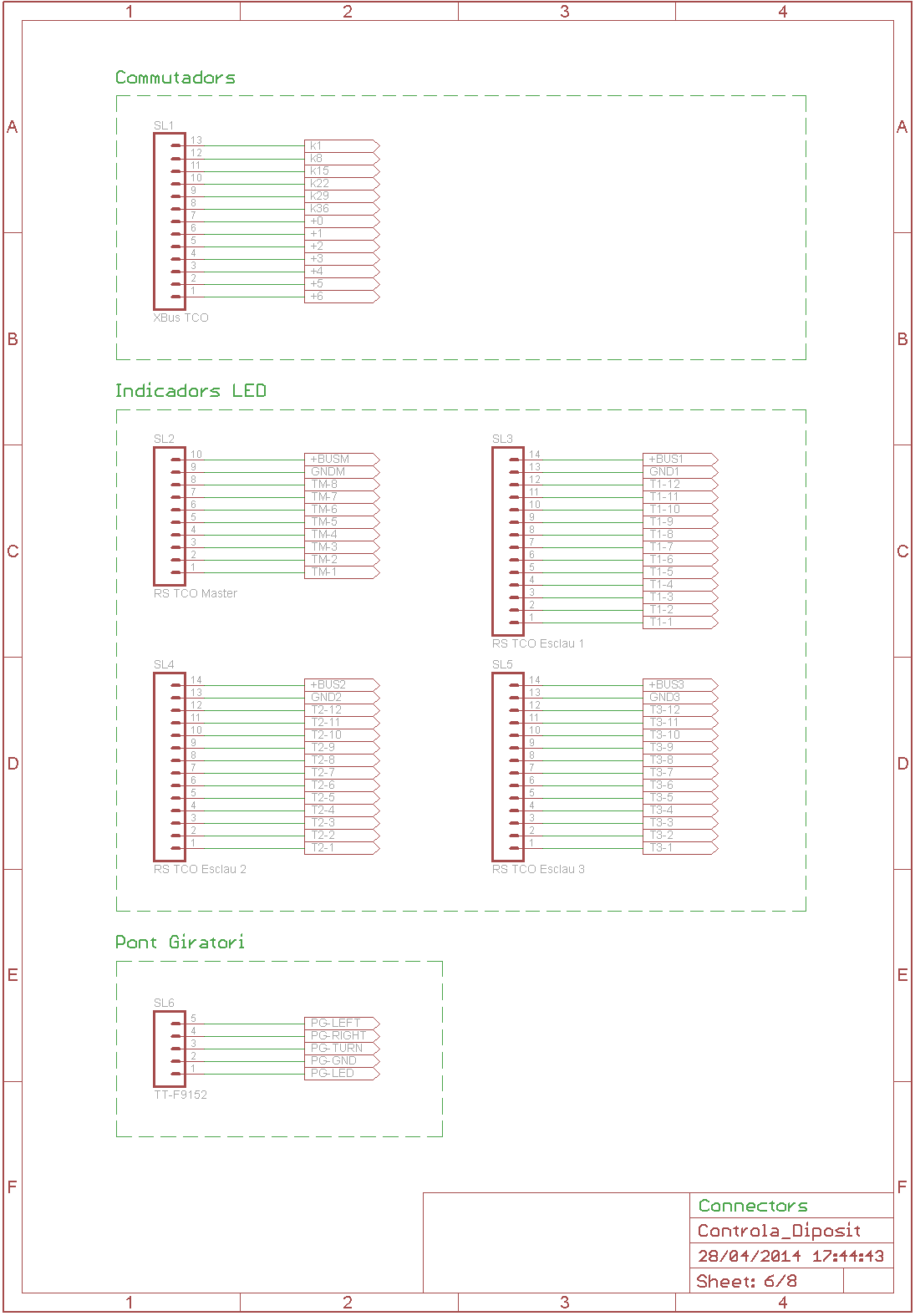 Finalment, a un parell de fulls més hi són, respectivament, l'esquema de connexionat dels comandaments del pont giratori i la relació de connectors que alimenten la resta d'esquemes i que s'han d'ubicat a la placa. Aquests elements no tenen cap problema, tret de recordar que el commutador per determinar la direcció de gir del pont giratori haurà de ser de tres posicions (posició central de repòs sense connectar cap sortida) sense enclavament a les posicions extremes, es a dir, com si fossin dos polsadors en un sol comandament.