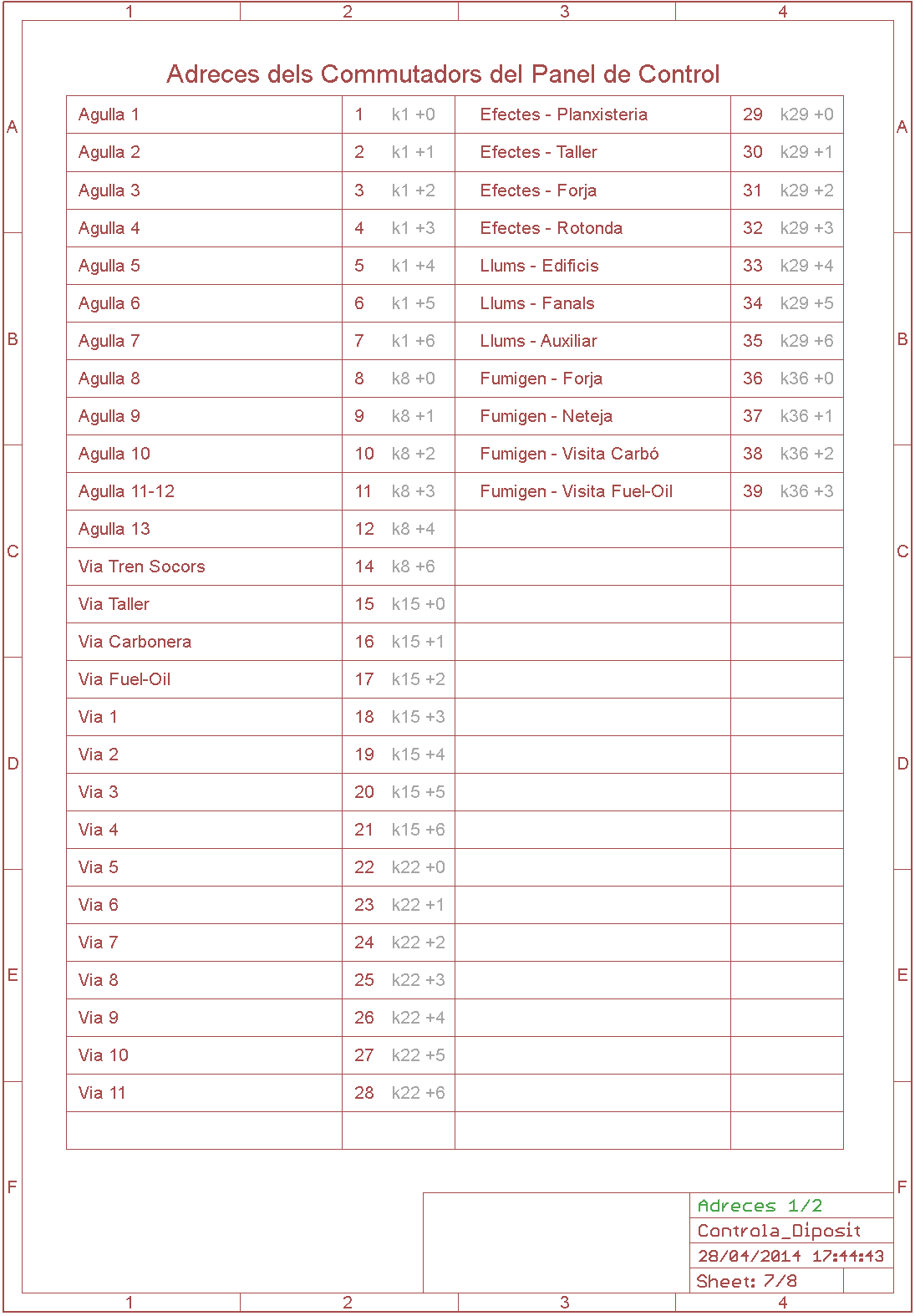 He documentat les adreces que he fet servir a un parell de fulls (adreces de commutadors i adreces de LEDs). Pren nota si us plau dels canvis que he hagut de fer.