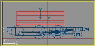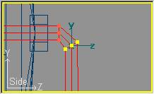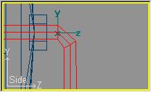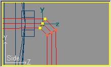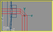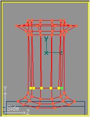 Ahora procederemos a dar al soporte su forma peculiar. Pasaremos a modo de edición de puntos con Mode » Point (o bien pulsando la tecla F8) y por cada sección horizontal entraremos en modo selección por ratón con Mode » Select (o pulsando la tecla F11) y seleccionaremos la pareja de puntos de una sola sección (de las centrales), para moverla en el eje Y (restringiendo el movimiento en los eje X y Z) de forma que las secciones se ajusten a los puntos que delimitan la silueta del soporte. Obtendremos una imagen semejante a la siguiente: