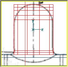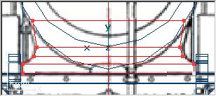 Finalmente ajustaremos la base del domo al contorno de la caldera. Para ello trabajaremos en la vista frontal y en modo de edición de puntos (pues vamos a deformar las tres secciones inferiores) con Mode » Point (o bien pulsando la tecla F8) y entraremos en modo selección por ratón con Mode » Select (o pulsando la tecla F11). Seleccionamos los puntos centro izquierda de las tres secciones inferiores, y a continuación repetimos la operación para seleccionar los puntos centro derecha de las mismas secciones, esta vez manteniendo pulsada la tecla Shift para añadir estos puntos a la selección anterior (ver imágenes siguientes). Este conjunto seleccionado lo desplazamos hacia abajo en el eje Y hasta que las líneas inferiores del domo se ajusten al contorno de la caldera (segundo círculo que aparece debajo del domo, pues el primero es la caja de humos y debemos ignorarla):