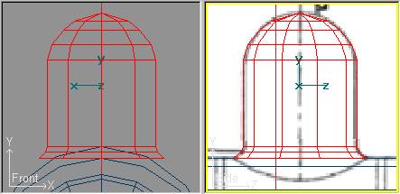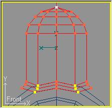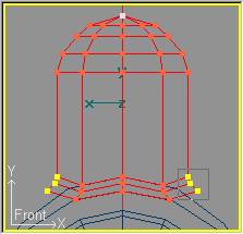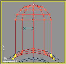 Pasamos a Transform » Scale Mode (o pulsamos la tecla S) para ajustar el diámetro de las secciones al contorno del domo en el Backdrop. Empezamos por la sección superior que cerraremos hasta que forme un sólo punto, y continuaremos con las siguientes. Las dos secciones inferiores en lugar de reducirlas las aumentaremos ligeramente de forma que también se ajusten al contorno del domo. El resultado se verá así: