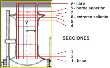 En la vista lateral pasamos a modo secciones con Mode » Cross Section (o pulsando la tecla F9) y procederemos a recorrer las secciones (tecla N) para moverlas, en el eje Y solamente, de forma que se sitúen en los puntos de cambio de curvatura del domo original. La sección superior (que he numerado como 9, o libre, para mejor comprensión) la dejaremos fuera de la chimenea y no nos preocuparemos de ella de momento.