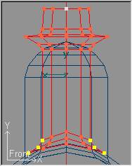 A continuación, transformaremos simétricamente la anchura de cada una de las tres secciones superiores con Transform » Scale Mode (o pulsando la tecla S) y restringiendo la transformación para el eje Y con Transform » Constrain Y (o pulsando la tecla Y) y el eje Z con Transform » Constrain Z (o pulsando la tecla Z). Empezaremos seleccionando la pareja de puntos de la sección central y desplazaremos con el ratón para estrechar la sección hasta que se ajuste al perfil del backdrop. Repetiremos la operación para la sección superior, pero esta vez ajustando la anchura a la pieza de la caja de humos (aunque con ello no sigamos escrupulosamente al Backdrop). Por último realizaremos nuevamente la operación con la sección intermedia a las dos modificadas y ajustando la anchura de forma que la silueta de la pieza nos de un aspecto correcto. Las secciones quedarán aproximadamente así:
