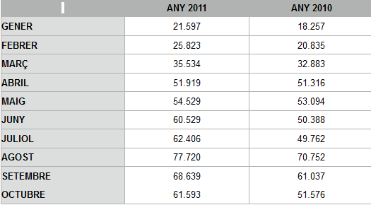 D’altra banda, cal destacar també que l’augment de passatgers del cremallera l’any 2011 respecte l’any 2010 no és superior només durant els mesos d’estiu, sinó que aquest augment és patent durant tots els mesos de l’any (fins a octubre). Així, l’acumulat en el que va d’any és de 526.842 viatgers, 60.786 viatgers més que en el mateix període l’any 2010, amb un augment global del 13%.