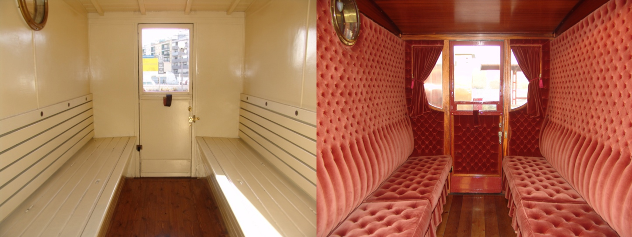 Detall de l’interior del cotxe de tercera i de primera respectivament. Foto: Museu del Ferrocarril de Catalunya